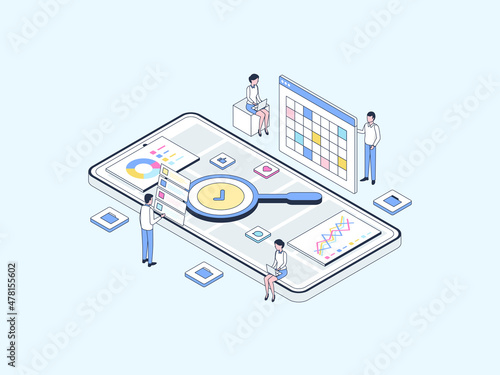 Vývoj hry, izometrická ilustrace plochého vektoru. Herní průmysl. Výroba mobilních a počítačových her.