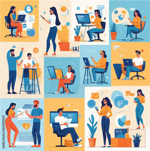 Garážová prodejní sada, ploché vektorové izolované ilustrace. Lidé kupují použitý domácí nábytek, domácí spotřebiče, oblečení, hudební nástroje, knihy, nádobí, sportovní předměty. Prodej na dvoře, bleší trh.