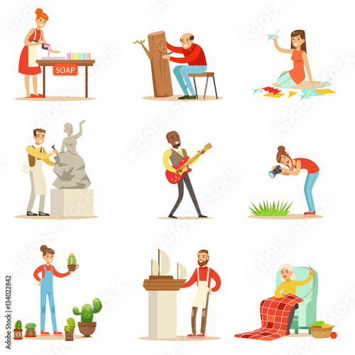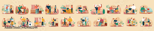 Garážová prodejní sada, ploché vektorové izolované ilustrace. Lidé kupují použitý domácí nábytek, domácí spotřebiče, oblečení, hudební nástroje, knihy, nádobí, sportovní předměty. Prodej na dvoře, bleší trh.