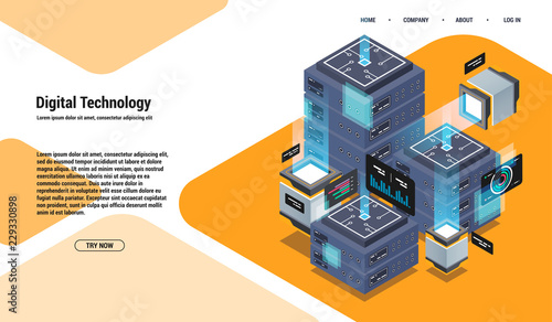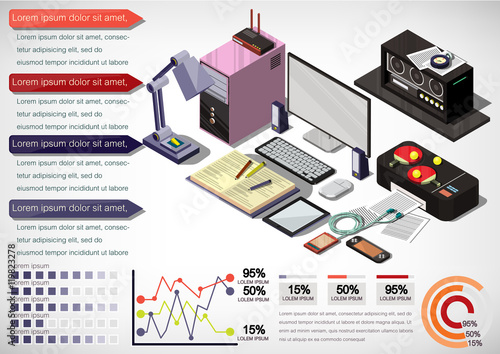Třídění odpadu infografika, vektorové ilustrace. Izometrická skládka domácího odpadu a zelené, šedé, oranžové koše na skleněné, organické a plastové odpadky resp. Separace odpadu.