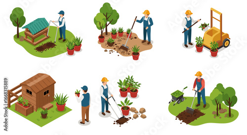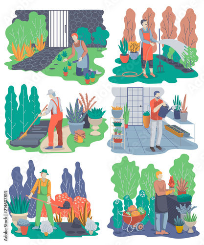 Profesionální zahradník prořezávání strom vektor. Zahradní pracovník se stará o řezání rostlin bush, řezání kmen, sekání trávy izolované nastavit na bílém pozadí. Zahradnické a krajinářské práce