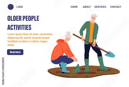 Zahradník muž kopání díry pomocí lopaty. Vektorový plochý design ilustrace izolované na bílém pozadí. Koncept zahradnictví pro webový banner, webovou stránku atd.