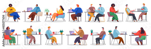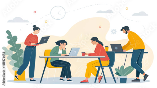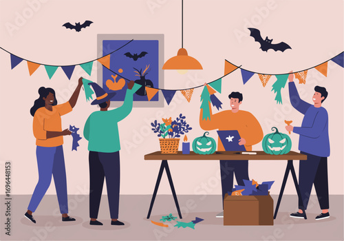 Vektorová ilustrace malých lidí, kteří pěstují velké hrnkové rostliny pomocí zahradního nářadí konev, hrábě. Zahradníci muži a ženy pečující o rostliny. Koncept zahradnictví pro webový banner, webovou stránku atd.