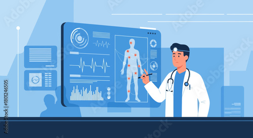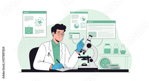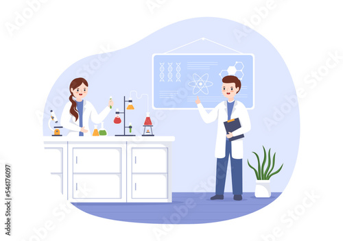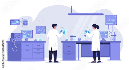 Genetická vědecká laboratoř. Vědci, vědci mužské postavy v bílých pláštích studují dna s laboratorním vybavením, ploché vektorové ilustrace. Biotechnologie, genetické inženýrství, věda a vzdělávání.
