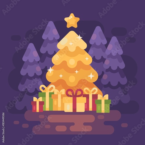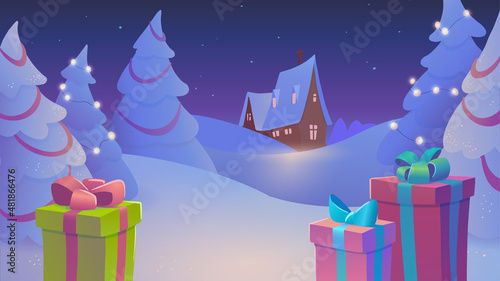 Dárková krabička se zlatou stuhou a lukem maketa na displeji pódium, papír řezané zimní pozadí, vektorové ilustrace. Šťastný Nový Rok, Veselé Vánoce sezónní výprodej, produkt balení reklamy šablony.
