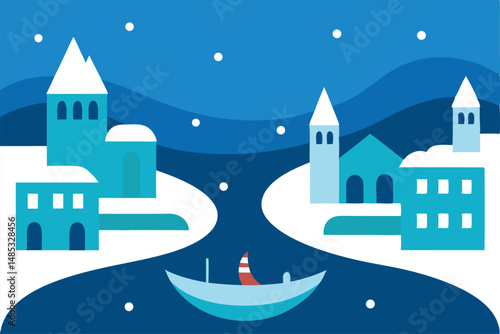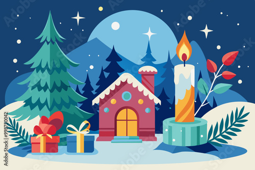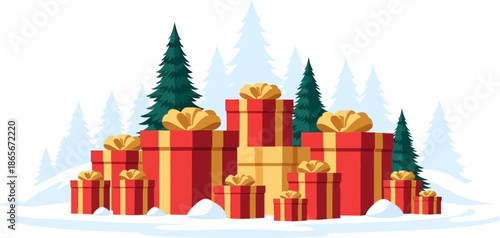 Dárková krabička se zlatou stuhou a lukem maketa na displeji pódium, papír řezané zimní pozadí, vektorové ilustrace. Šťastný Nový Rok, Veselé Vánoce sezónní výprodej, produkt balení reklamy šablony.