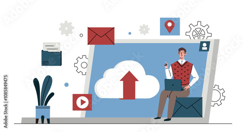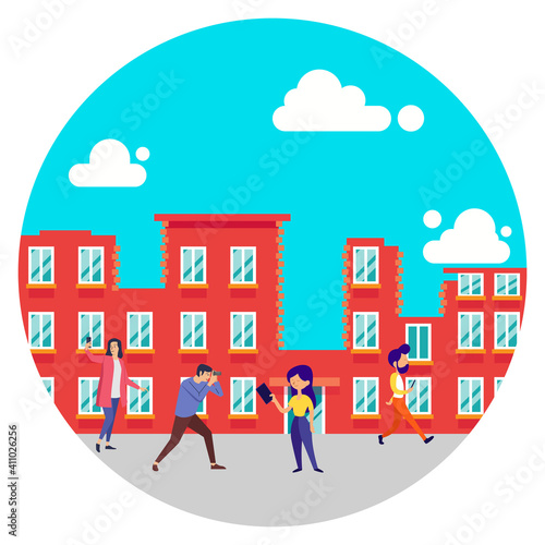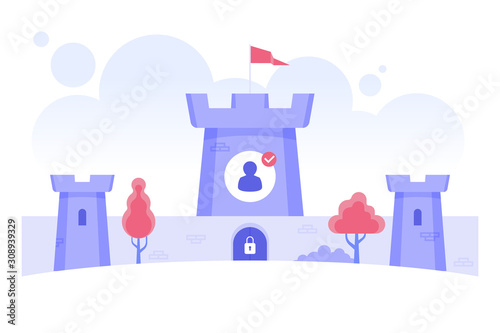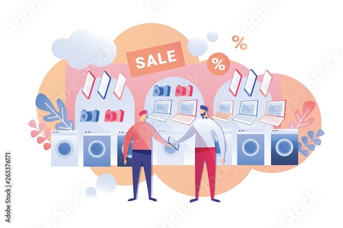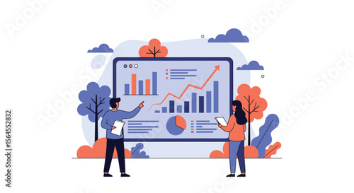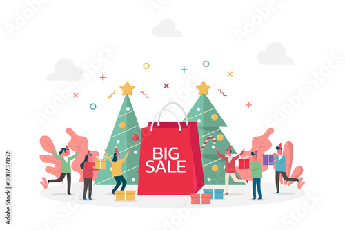 Micro znaky drží obrovskou dárkovou kartu s růžovou stuhou a lukem, vektorový plochý styl designu ilustrace. Slevová dárková karta, poukaz, certifikát marketing strategy tool.