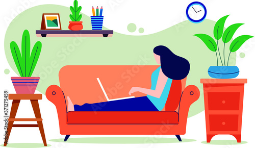 Dívka čtení knihy doma, ploché vektorové ilustrace. Mladá žena, kniha milenec relaxační, se těší volný čas s čtení oblíbeného časopisu v útulném obývacím pokoji. Hobby a volnočasová činnost, vzdělávání.
