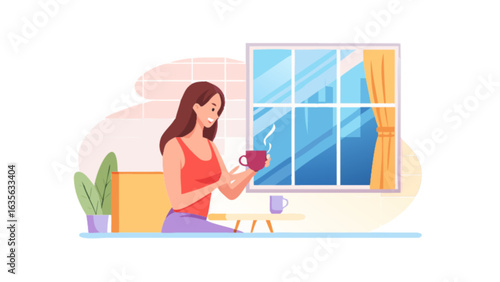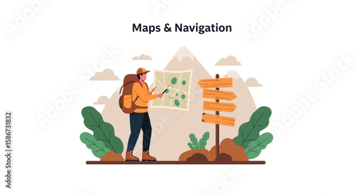 Dívka s přestávkou na oběd a jíst nudle na lavičce v parku. Žena pořizování selfie fotografie s přírodou krajiny. Cestovní koncept ilustrace. Vektor web design šablony.
