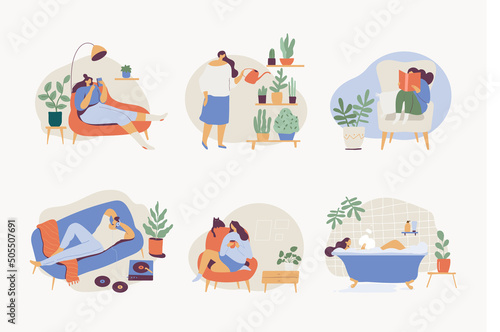 Dívka, kterým se na pohovce a poslouchat hudbu. Mobilní telefon podcast a hudební stream app. Podcast koncept ilustrace. Vektor web design šablony. Playlist, sluchátka.