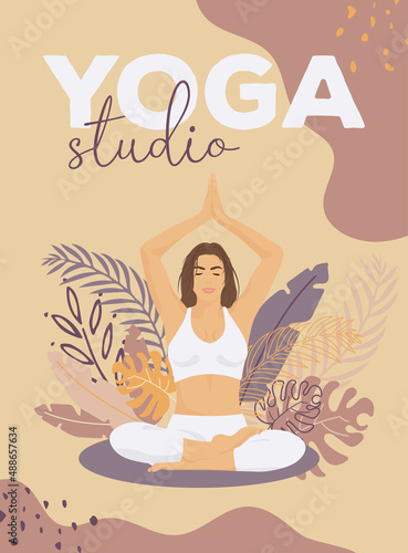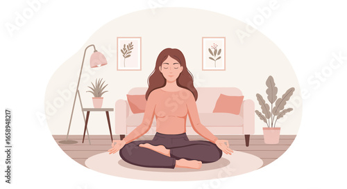Dívka poslouchat hudbu ve sluchátkách a meditovat doma. Žena dala květiny do vázy. Hobby a volný čas koncept ilustrace. Vektor web design šablony. Vstupní stránka webové stránky ilustrace.