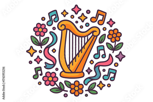 Krásná mladá dívka hraje na harfu, vektorové ilustrace v papírovém uměleckém řemeslném stylu. Žena harfista hudebník silueta s holubicemi, noty.