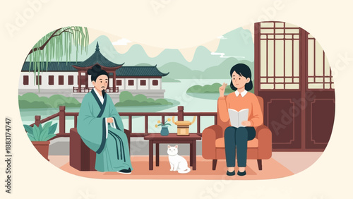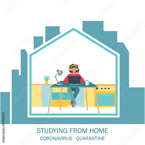 Dívka čtení knihy sedí v bean bag židle na balkoně, ploché vektorové ilustrace. Mladá žena studuje, relaxuje, užívá si volného času čtením oblíbené knihy. Hobby a volnočasová činnost, vzdělávání.