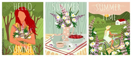 Dívka na kole na venkovské silnici. Venkovní přírodní krajina a venkovská farma. Dívka s čerstvými květinami. Vektor web design šablony plakát.