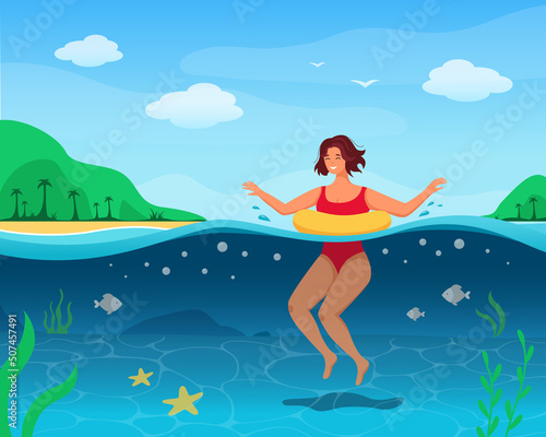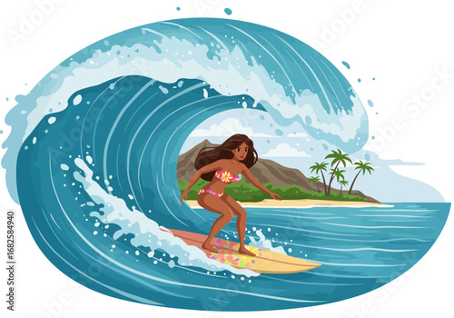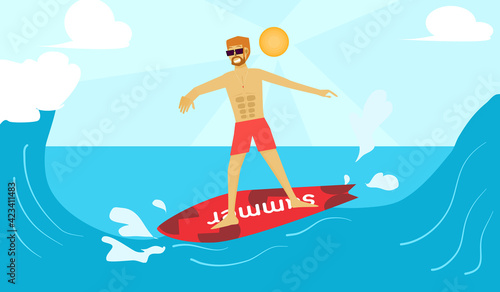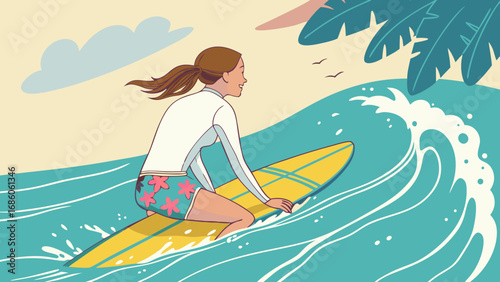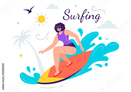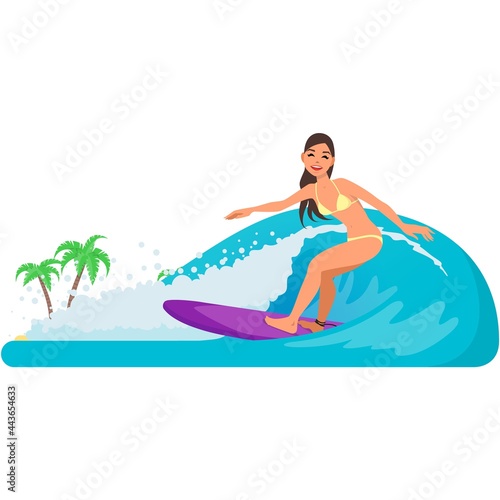 Vektorová ilustrace mladé dívky stojící na surf a jízda na vlně oceánu. Vodní sporty koncept designový prvek v plochém stylu.