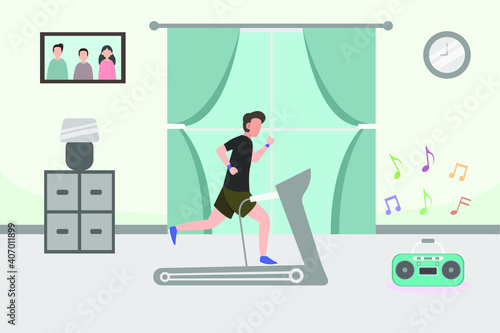 Dívka běží na běžeckém pásu ve fitness centru. Tělocvična a zdravý životní styl koncept vektorový plakát v plochém stylu.