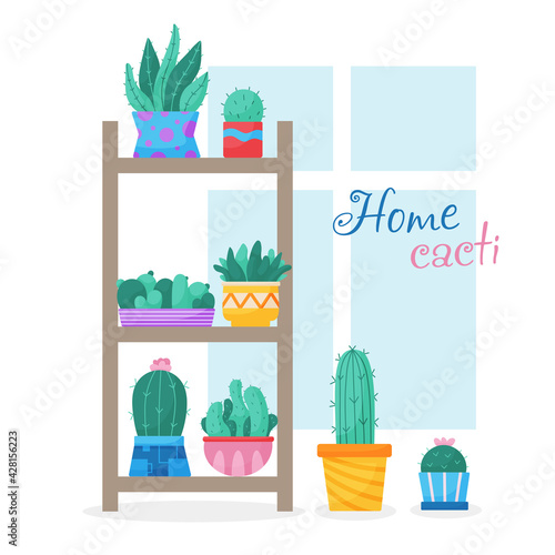 Dívka se stará o domácí rostliny rostoucí v květináčích. Pokojové rostliny a home garden concept ilustrace. Vektor web design šablony. Interiér s Kaktusy a zelenými rostlinami.