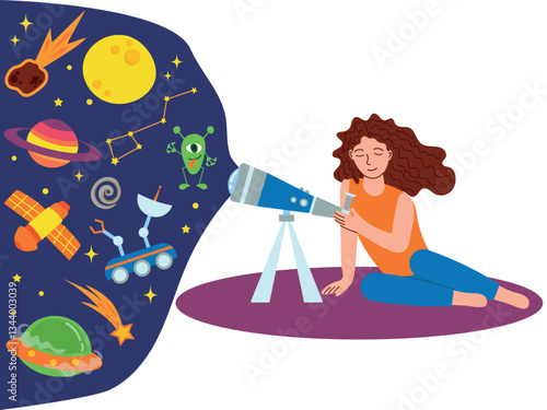 Dívka sleduje hvězdy na noční obloze pomocí dalekohledu. Stargazing a astronomie vector concept ilustrace. Piknik s hvězdnou noční oblohou a dalekohledem. Šablona návrhu webových stránek.