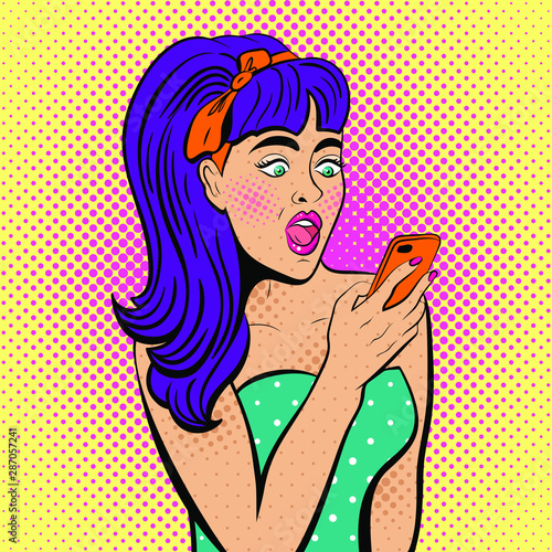 Vektorové ilustrace krásné sexy pin up dívka s dlouhými vlasy, Následujte mě nápisy. Glamour žena portrét v retro pop art komické stylu.