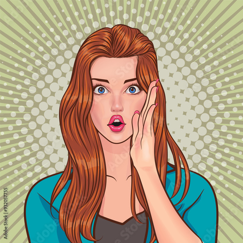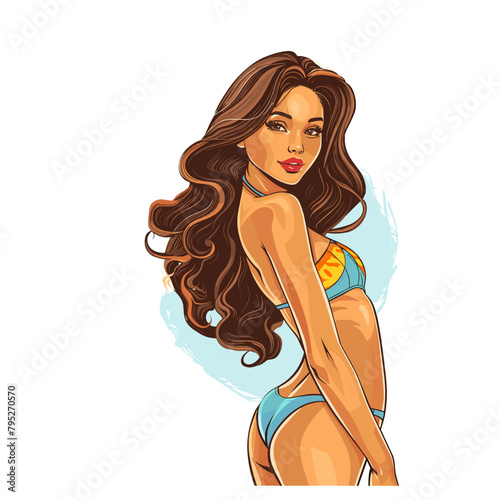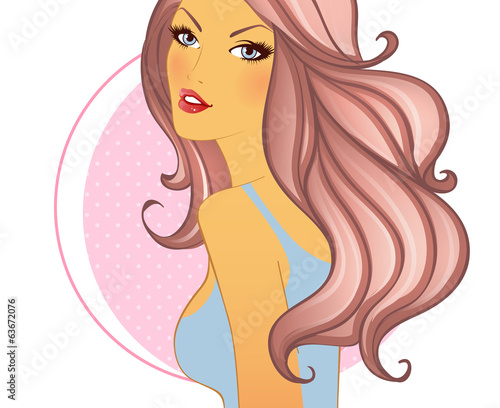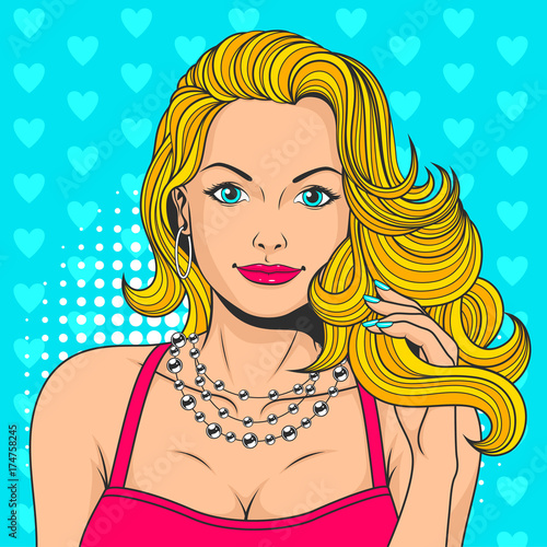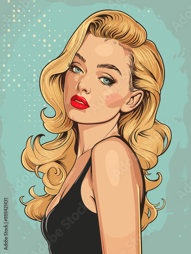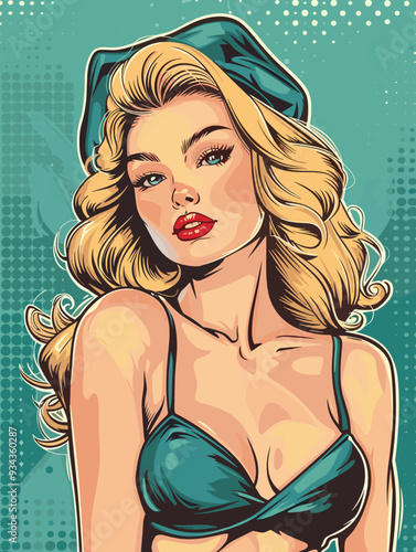 Vektorové ilustrace krásné sexy pin up dívka s dlouhými vlasy. Glamour žena portrét v retro pop art komické stylu.