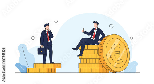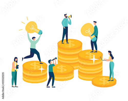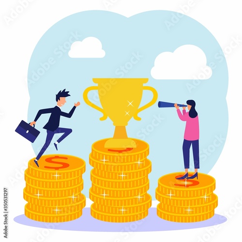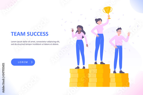 Obchodní tým slaví vítězství. Nejlepší zaměstnanec na vrcholu mince hromadu pódium drží trofej award cup, ploché vektorové ilustrace. Dosažení cíle, kariérní růst, finanční úspěch.