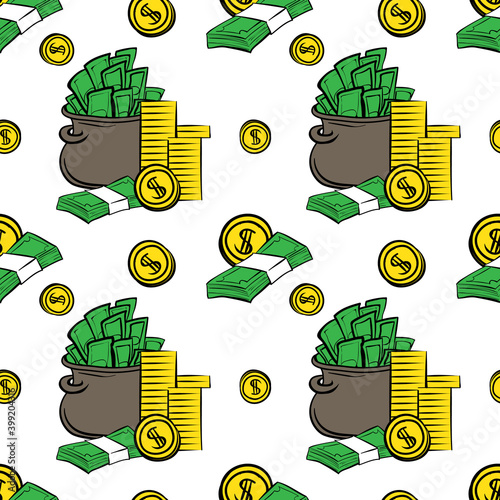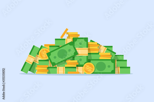 Zlaté pruty, bankovky a dolarové mince. Obchodní a finanční trhy koncept vektorové ilustrace v plochém stylu designu.