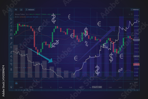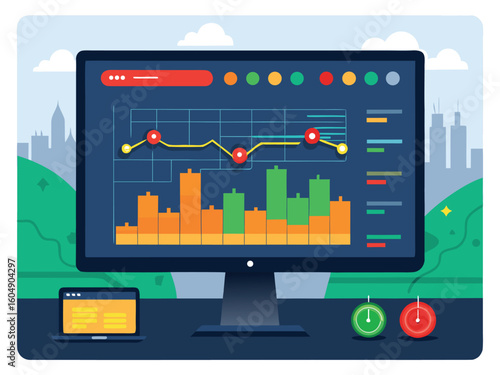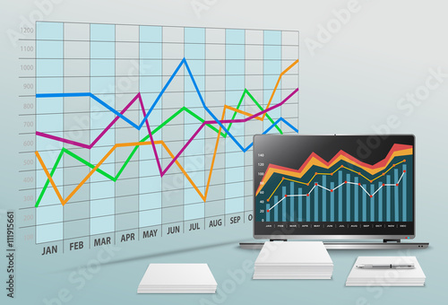 Vektorová ilustrace ceny zlata v plochém stylu. Burzovní graf na obrazovce notebooku. Hromada peněz, zlaté pruty.