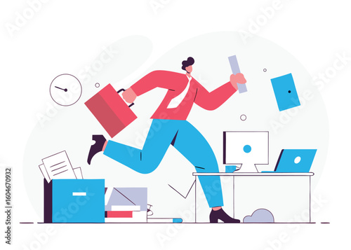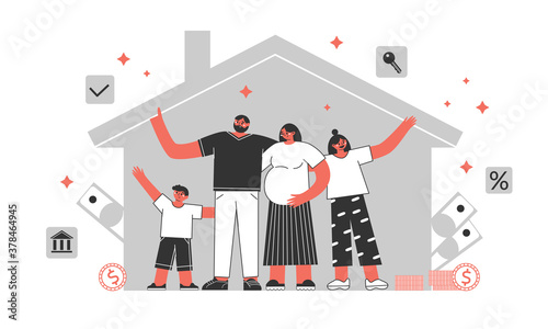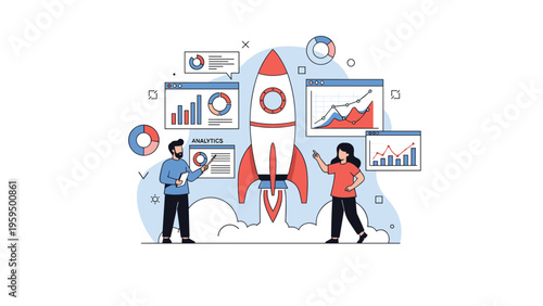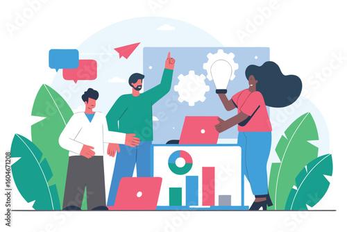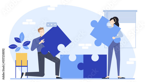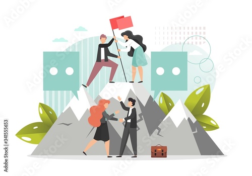 Mužské a ženské postavy obchodní partneři stojící na vrcholu hory s vlajkou, potřesení rukou slaví dobrý obchod, vektorová plochá ilustrace. Hodně, partnerství, dohoda a podání ruky.