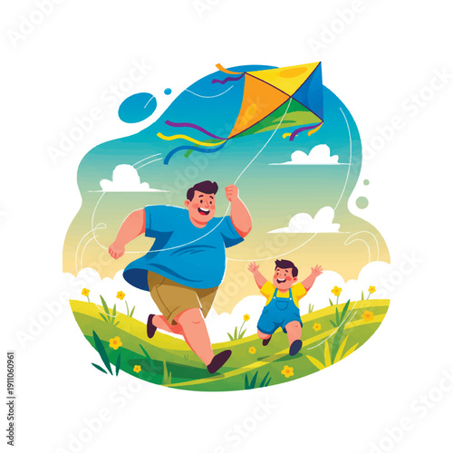 Šťastný dědeček chodí s vnukem sedícím na ramenou v parku, ploché vektorové ilustrace. Děda a vnouče tráví čas společně. Vztahy prarodičů s vnoučaty.