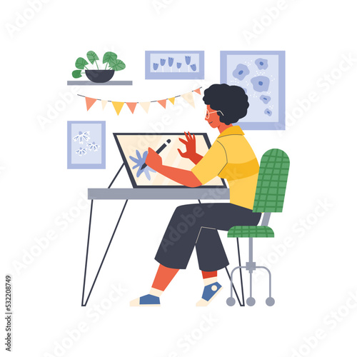 Grafický designér vytváří vlastní písmo pomocí počítačového softwaru sedí u stolu, vektorové ploché izometrické ilustrace. Digitální umělec, ilustrátor v práci. Grafický design kreativní profesionální pracovní prostor.