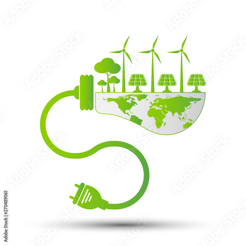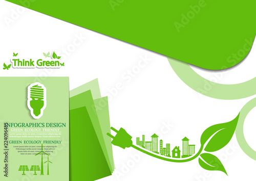 Zelené město eco energy vector. Životní prostředí a ekologie uložit ilustrace. Městská budova Panoráma pozadí a napájecí zástrčka v papíru řez umění řemesla styl designu