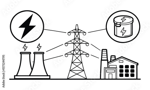 Vektorové ilustrace vysokonapěťových vedení, větrných turbín, pracovníků držících solární panel, baterie, zařízení. Zelené zdroje energie, koncept výroby elektřiny z obnovitelných zdrojů pro webovou stránku banneru.