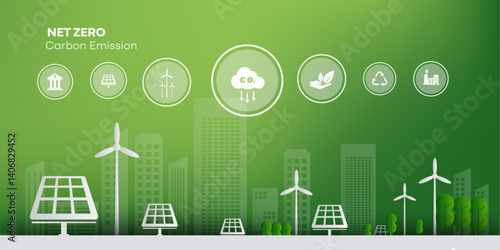 Zelená energie web banner šablona. Ekologické zelené město s větrnými turbínami a solárními panely, vektorové ilustrace ve stylu papírového umění. Úspora životního prostředí, alternativní energie, ekologický koncept.