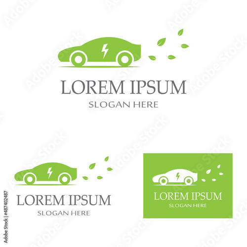 Zelený list s elektrickým autem, siluety městských budov, vektorové ilustrace v papírovém uměleckém stylu. Ekologické město, koncept ekologické dopravy.