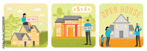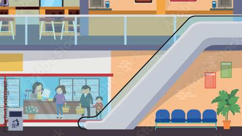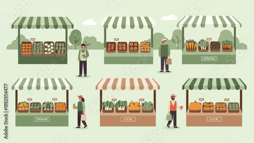 Obchod s potravinami, farmers market vektorová šablona plakátu. Obchod s potravinami, interiér supermarketu s banánem, jablkem, melounovým ovocem, mléčnými výrobky, olivovým olejem, ovocnými konzervami na policích, ploché ilustrace.