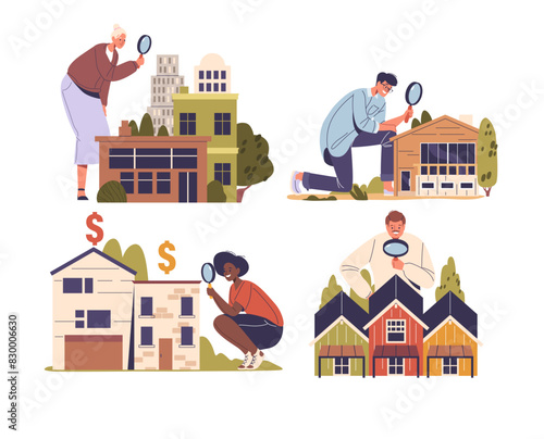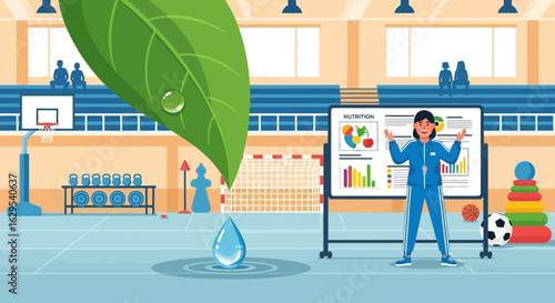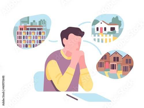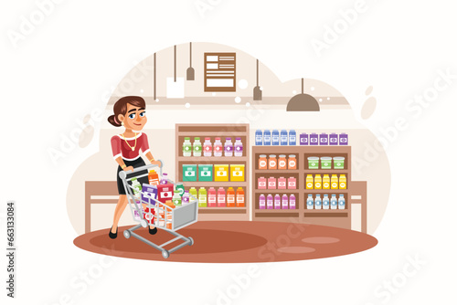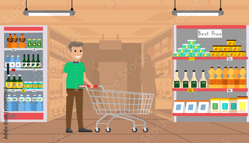 Potravina. Muž s trolly plný potravinářských výrobků, ploché vektorové ilustrace. Interiér obchodu s potravinami. Mléko, olej, ovoce, konzervy na policích. Nakupující s nákupním vozíkem v supermarketu, obchoďáku, obchodě