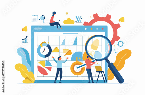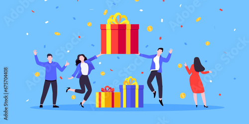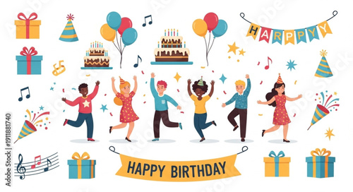 Skupina podnikatelů slaví všechno nejlepší k narozeninám, vektorové ploché ilustrace. Narozeninová oslava s přáteli, kolegy a velký dort se svíčkami, dárky.