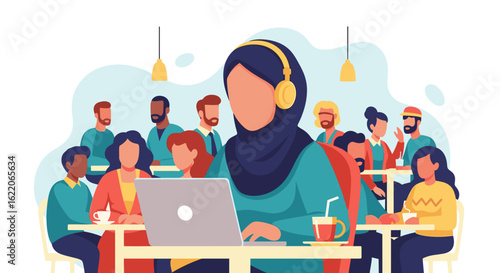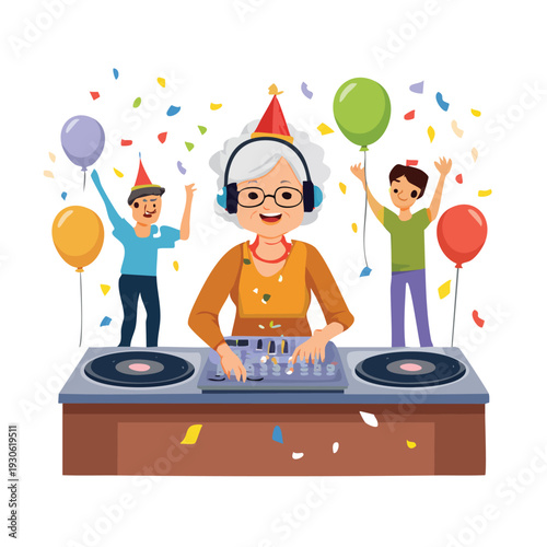 Skupina lidí slaví všechno nejlepší k narozeninám, vektorové ploché ilustrace. Velká dárková krabička, drobné postavy tančí a baví se. Barman dělá alkoholový koktejl, dj hraje hudbu. Narozeninový dj dance disco party.
