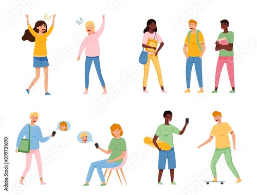 Skupina mužů a žen používajících mobilní telefony. Vektorové ilustrace izolovaných na bílém pozadí. Lidé mluví, poslouchají hudbu, pořizují selfie, e-mailem, textové zprávy na cestách.