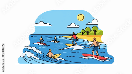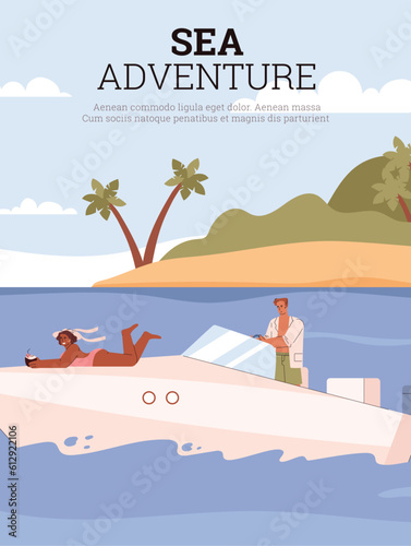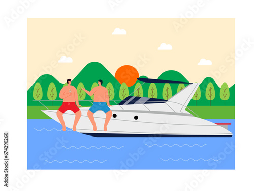 Skupina turistů se těší jachta plavba v blízkosti tropické přímořské vektorové ilustrace. Šťastní mladí lidé, přátelé tým baví, plavání, opalování při odpočinku během letních prázdnin