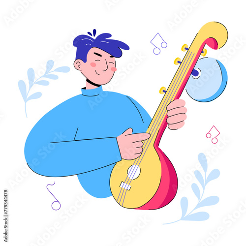 Kytarista vector. Muž znak hrát na kytaru ikonu. Hudební umělec izolovaných na bílém pozadí