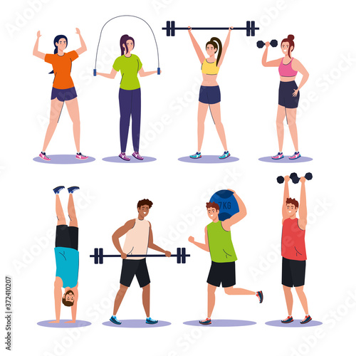 Vektorová sada fitness lidí cvičících s činkami, činkou, švihadlem a osobním trenérem. Gym lidé plochý styl designové prvky, ikony izolované na bílém pozadí.