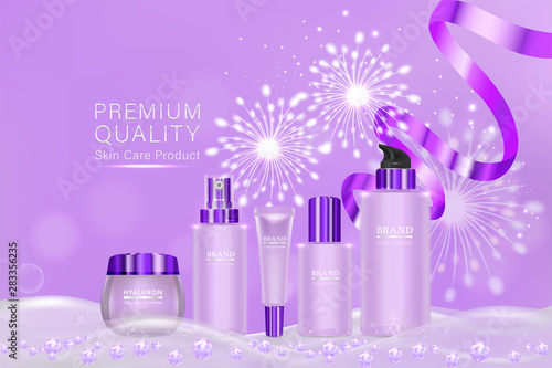 Vlasy kondicionér reklamy vektorové papír střih ilustrace. Produkt péče o vlasy vlasový kondicionér plastová láhev balení mock up a krásná žena s růžovými dlouhými vlnitými vlasy.