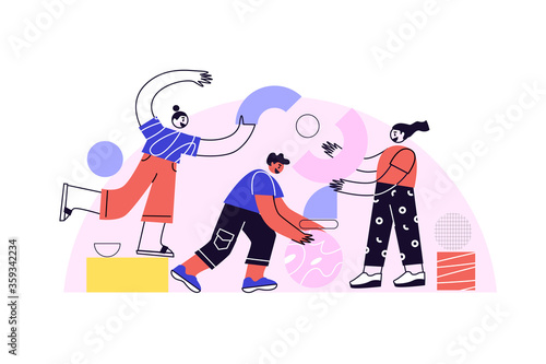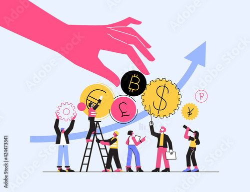 Obrovská žena a mikro postavy kadeřníci curling vlasy pomocí natáčky, vektorové ilustrace. Koncept služeb kosmetického salonu pro webový banner, webovou stránku atd.