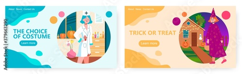 Halloween holiday party vector concept ilustrace. Muž v Halloweenském kostýmu chodí v noci strašidelný hrad. Dívka počítat sladkosti a peníze po koledě nebo léčbě hry. Šablona návrhu webových stránek.