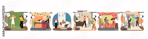 Halloween oslava scéna set, plochý vektor izolované ilustrace. Lidé se připravují na Halloweenskou párty, tančí v karnevalových kostýmech, děti koledují nebo ošetřují.