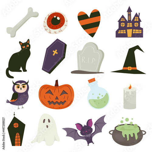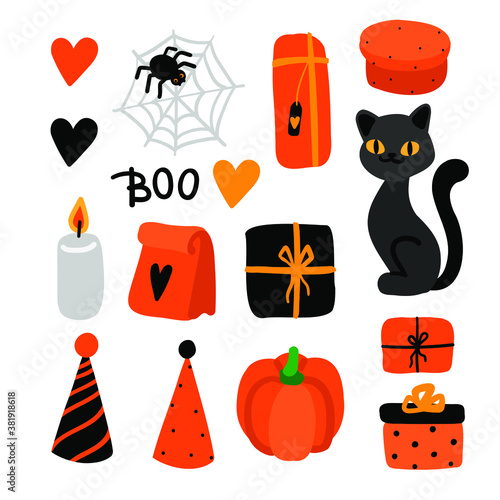 Halloween vektorové strašidelné 3D ikona. Izometrický hororový duch, dýně, netopýr, pavouk, dárková krabička, svíčka, oko. Lebka a klobouk izolované nastavit na bílém pozadí. Trick or treat říjnová párty ilustrace