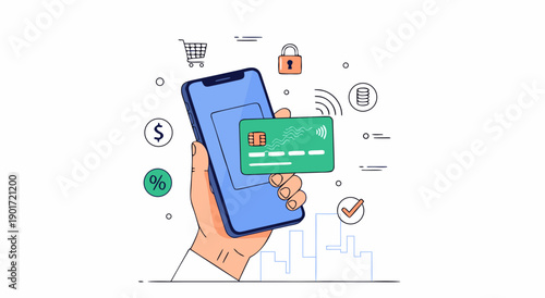 Ruční držení smartphonu s lahodnou pizzou na obrazovce, vektorové ilustrace v papírovém uměleckém stylu. Online objednávka a doručení pizzy.