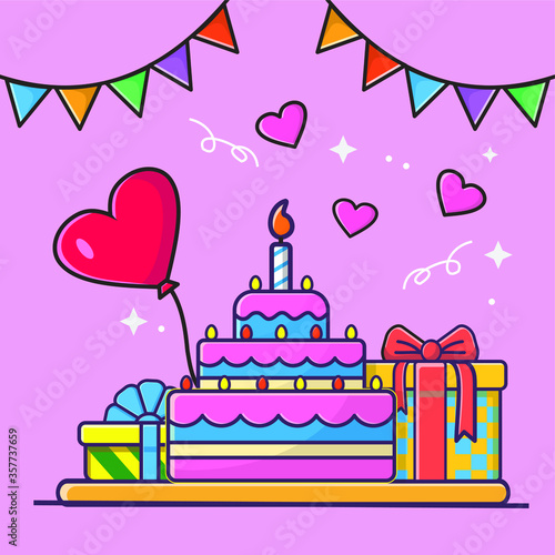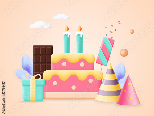 Všechno nejlepší k narozeninám dekorace. Pohlednice šablona s 3D vektorové dort a svíčky, čokoláda, slavnostní čepice, dárková krabička a konfety petardy ilustrace