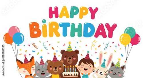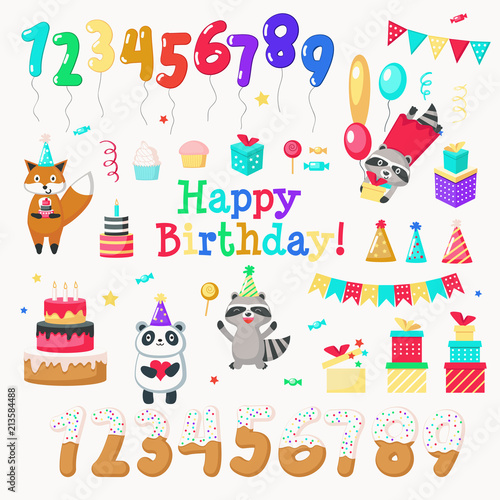 Všechno nejlepší k narozeninám icon set. Vektor ručně kreslená roztomilá zvířata fox mýval panda, číslice, narozeninový dort, sladkosti, dárkové krabičky, balónky, party klobouky a provázkové vlajky. Pozvánka blahopřání designové prvky.